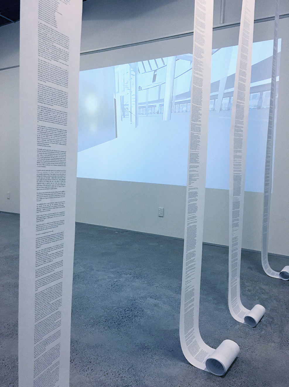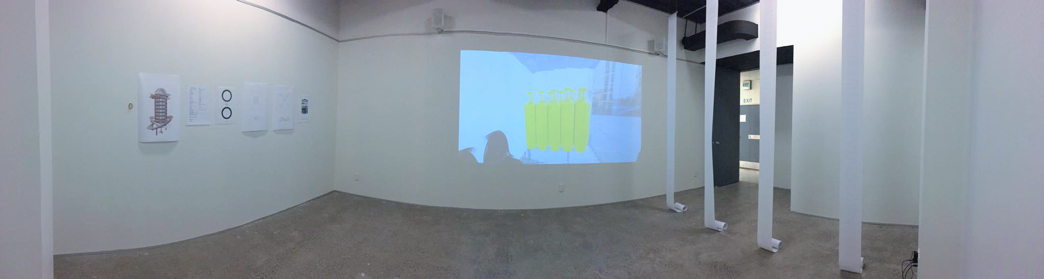 The installation comprised of 1 projected moving image work, an audio track, 6x prints and 4x text works. The installation took place at Whitecliffe college graduate exhibition in 2020